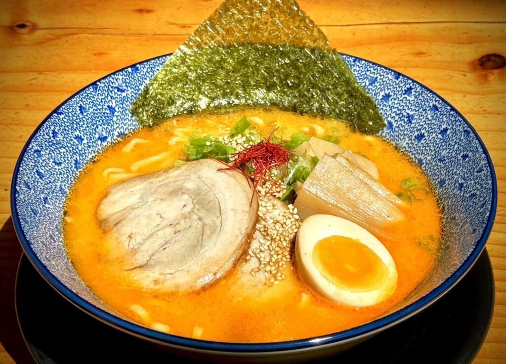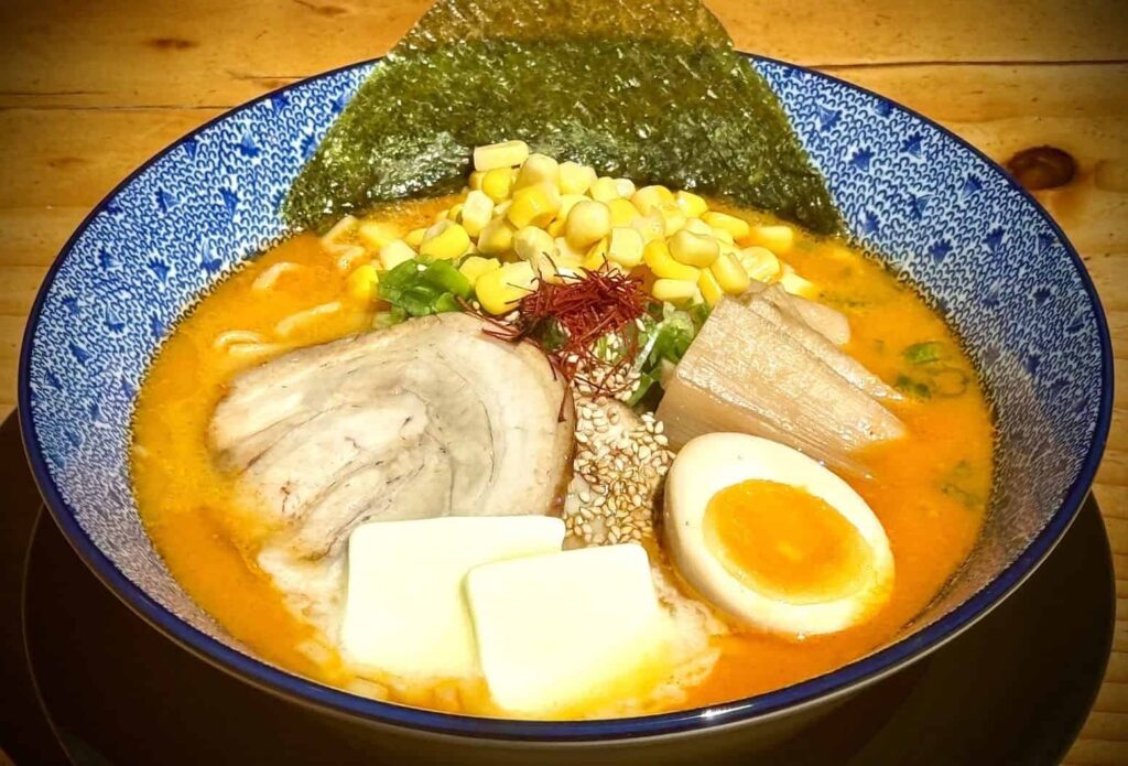 Extra rich and mildly spicy Hokkaido-style miso broth, flavored with creamy butter. Wheat noodles, chashu pork, menma, ajitsuke tamago (egg), butter, corn, nori dry seaweed, green onion, sesame seeds, and chili strings.