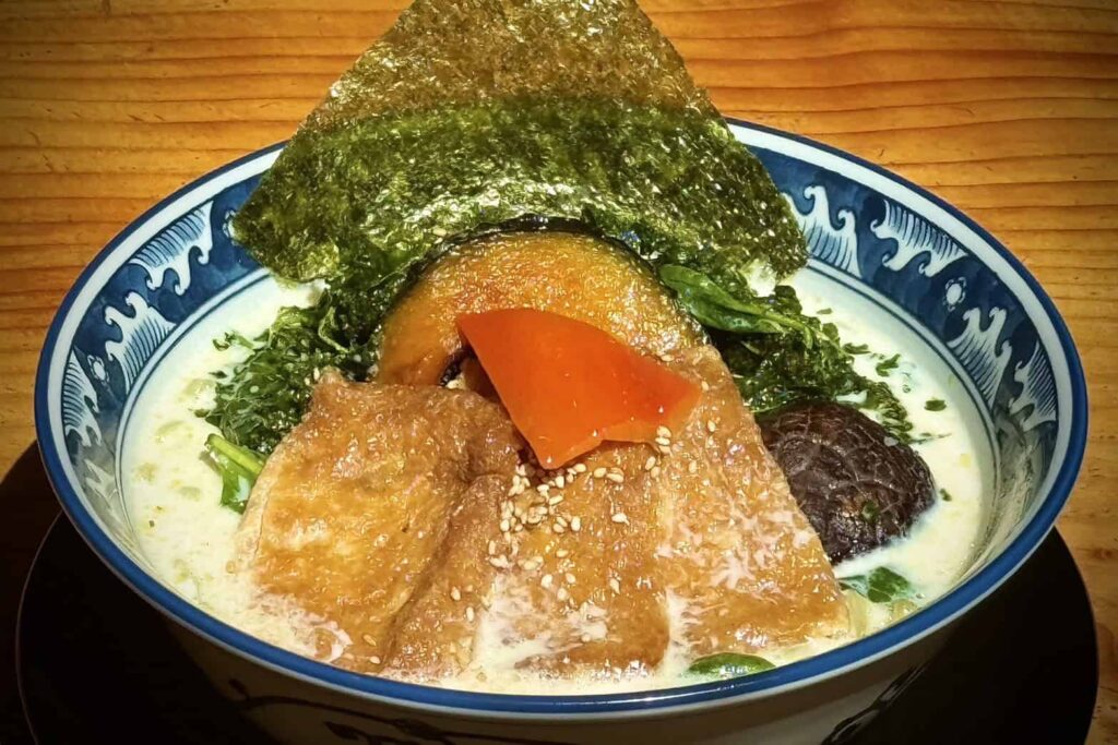 Rich and creamy vegan broth made with shiitake mushroom dashi, soy milk and original sesame base. Spinach flavored wheat noodles, Inari (sweet fried tofu), bell pepper, fried kale, kabocha squash, Nori (dried seaweed), Shiitake mushroom, sesame seeds